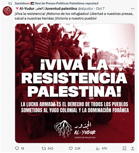 Sumar, une plateforme composée, entre autres, du Parti communiste espagnol, dont Mme Díaz est une militante, entretient des liens étroits avec Samidoun. Cette organisation a été identifiée par Israël comme le bras armé du groupe terroriste Front populaire de libération de la Palestine (FPLP) le 21 février 2021.