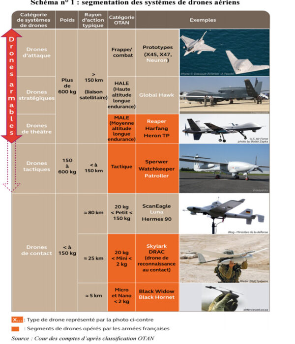 Notons que les Reapers, des drones d’attaque moyens, dit drones de théâtre, s’insèrent au sein de la classification OTAN dévoilée par la Cour des comptes :