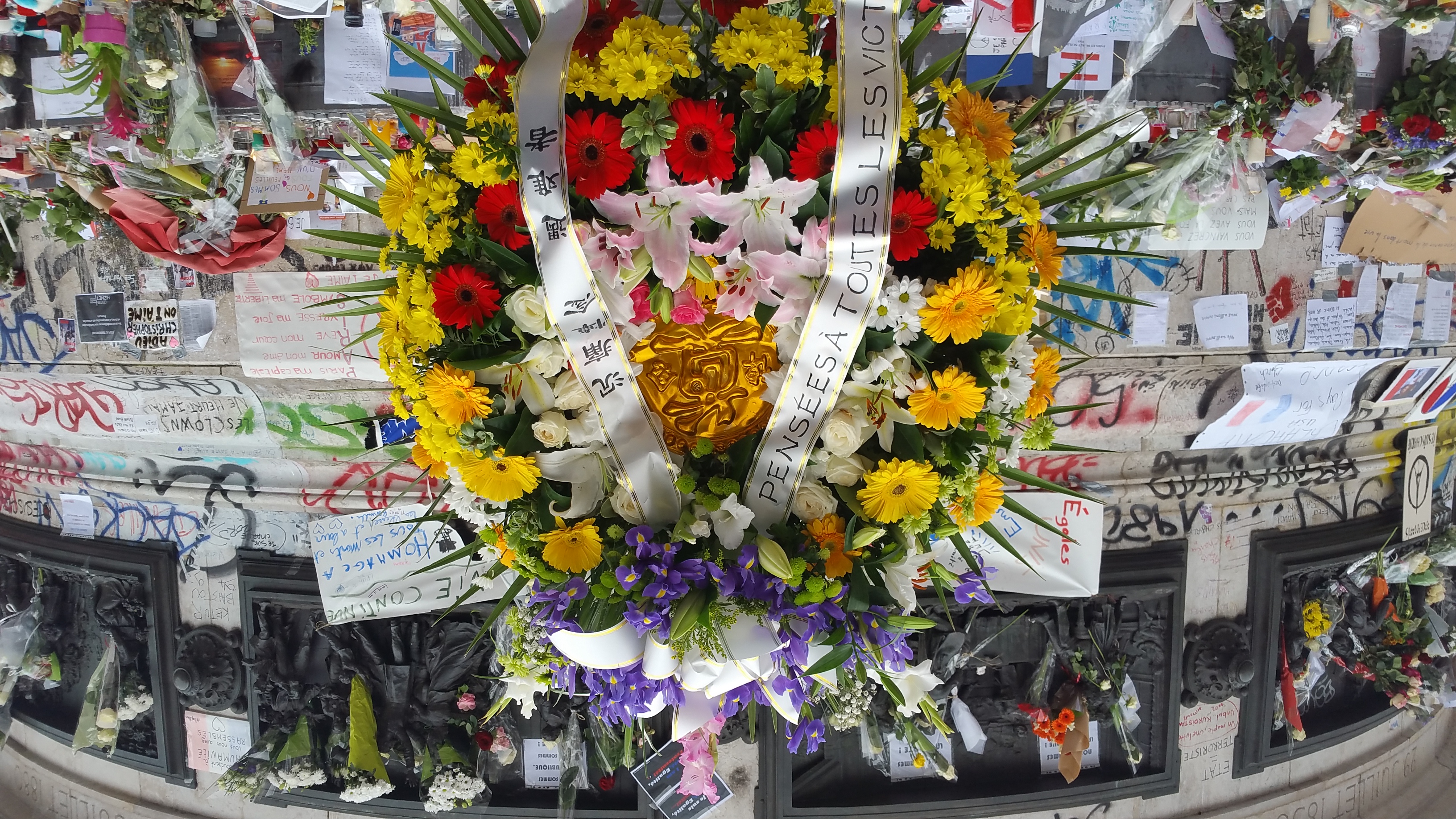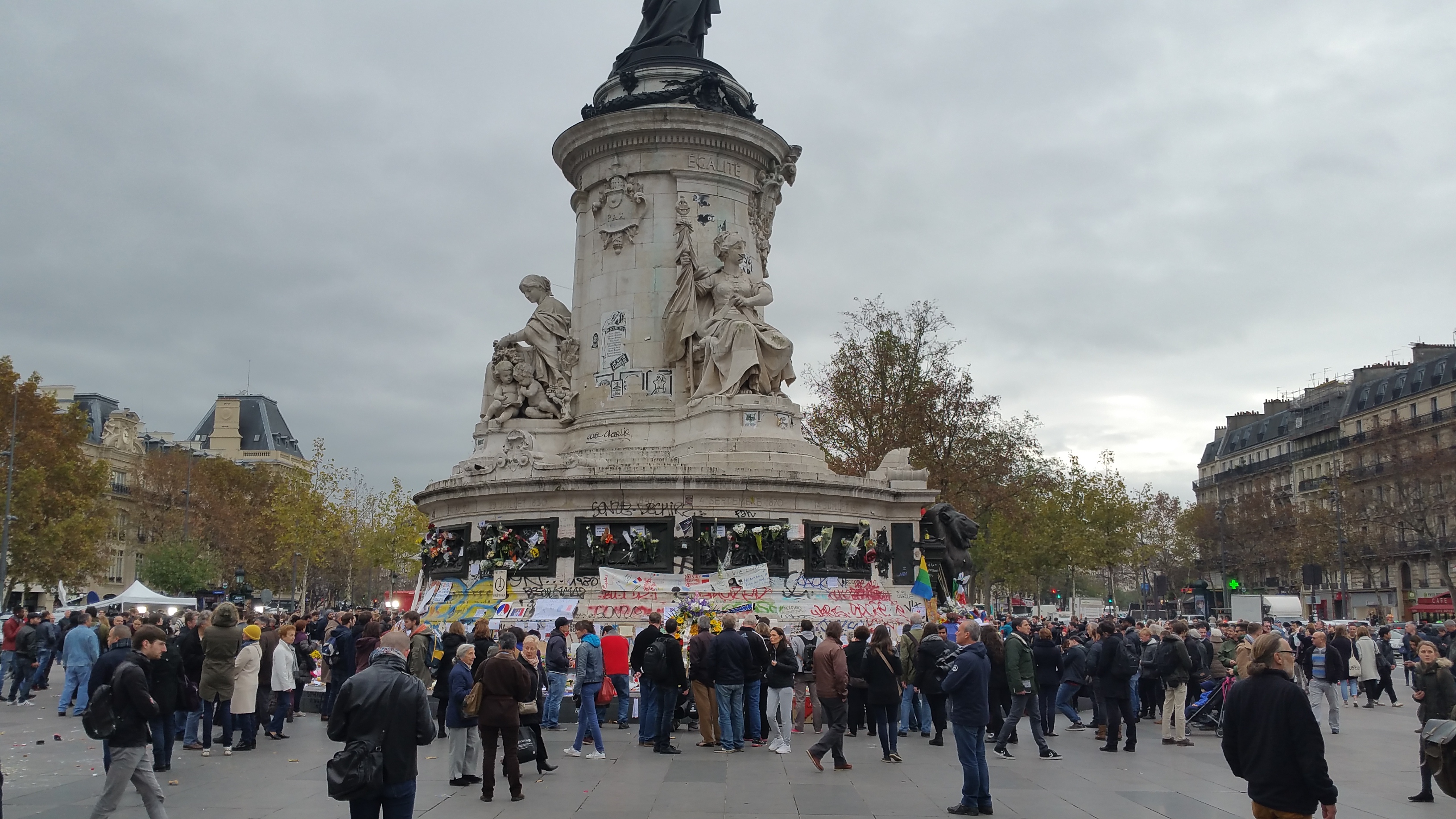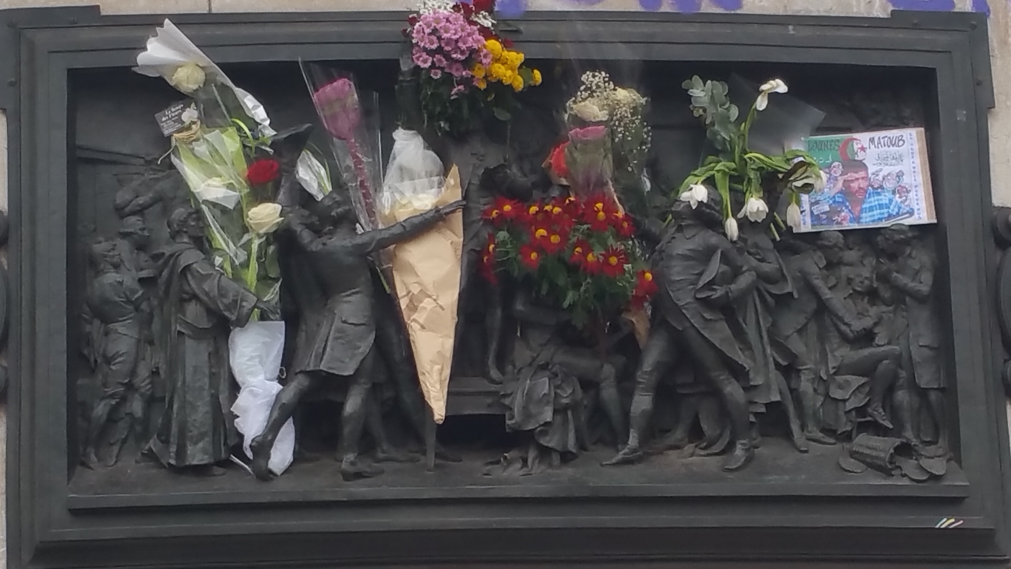 11h45. Sur la Place de la République, le bruit de la circulation d’un lundi, étouffant et quasi perpétuel, ne saurait déconcentrer le groupe de personnes rassemblées autour du monument. Trois cercles concentriques sont formés et se renforcent progressivement autour des statues : les bougies et les fleurs, les Parisiens et passants, les caméras et véhicules des journalistes. À midi, la place est noire de monde. Une minute de silence, des applaudissements, puis chacun repart. La circulation reprend.