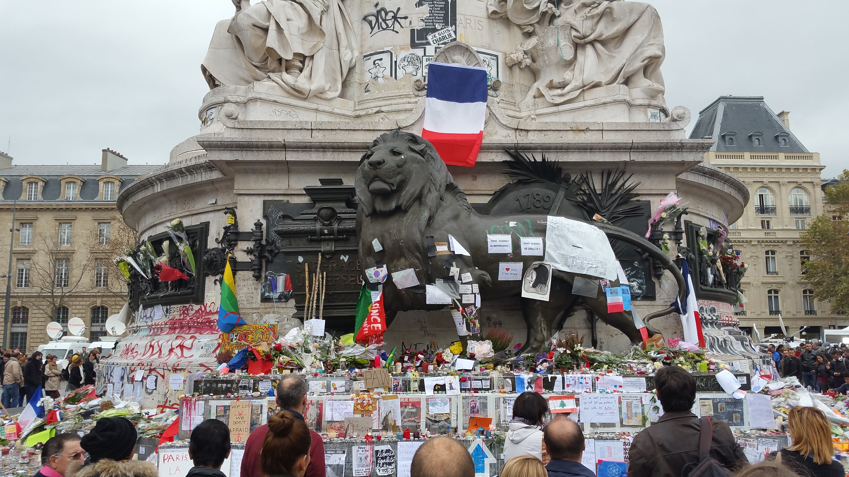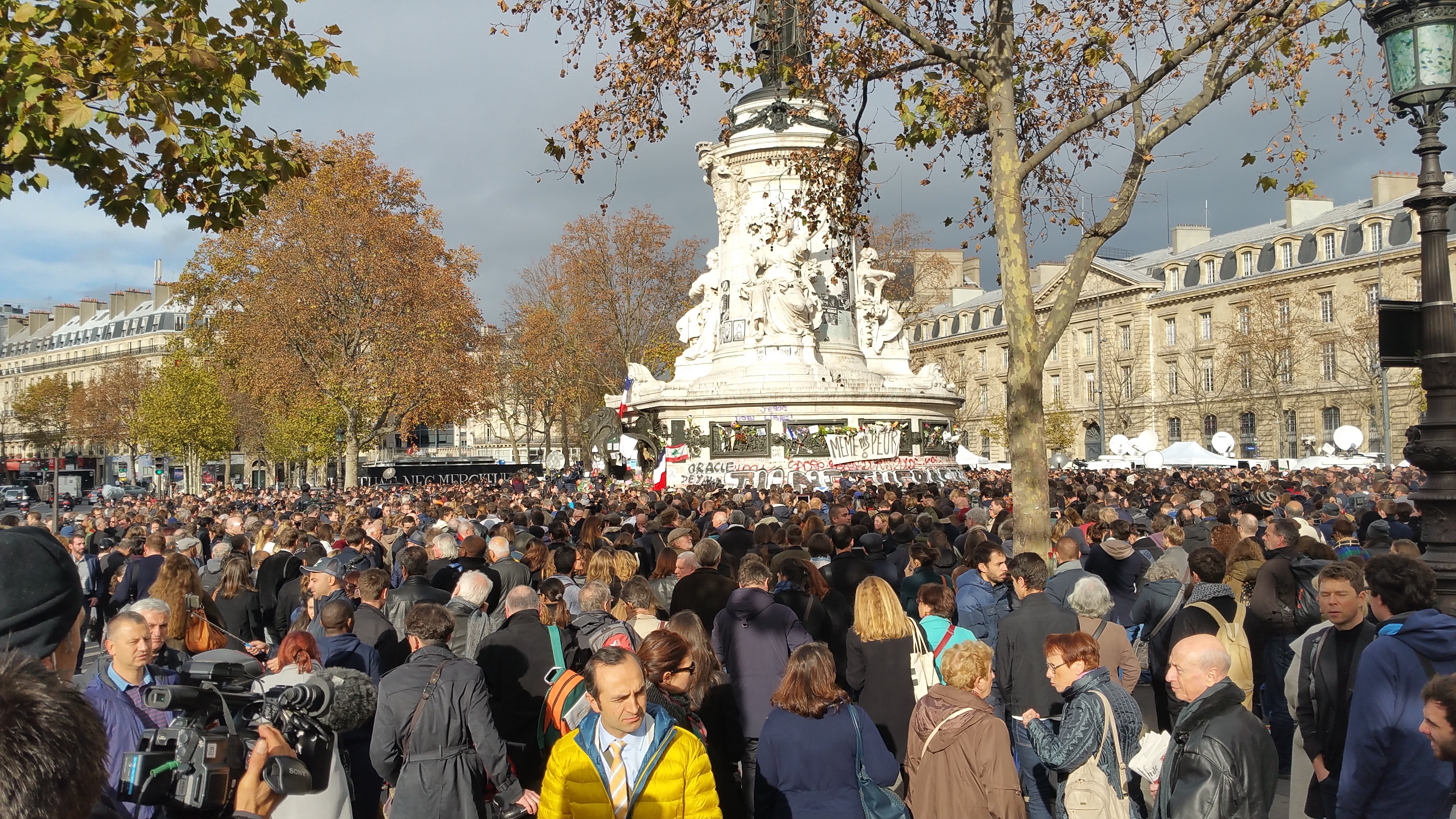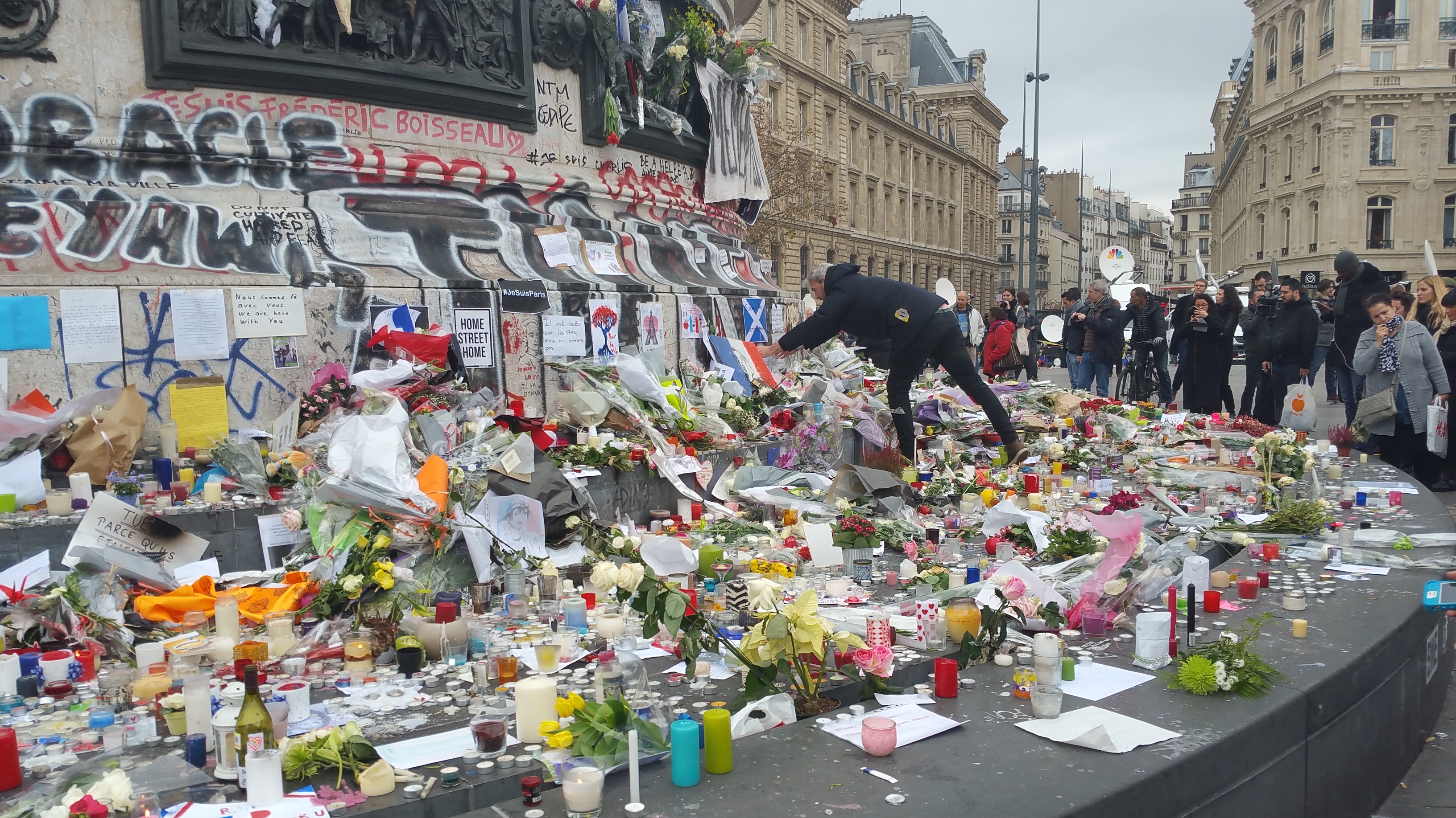 11h45. Sur la Place de la République, le bruit de la circulation d’un lundi, étouffant et quasi perpétuel, ne saurait déconcentrer le groupe de personnes rassemblées autour du monument. Trois cercles concentriques sont formés et se renforcent progressivement autour des statues : les bougies et les fleurs, les Parisiens et passants, les caméras et véhicules des journalistes. À midi, la place est noire de monde. Une minute de silence, des applaudissements, puis chacun repart. La circulation reprend.