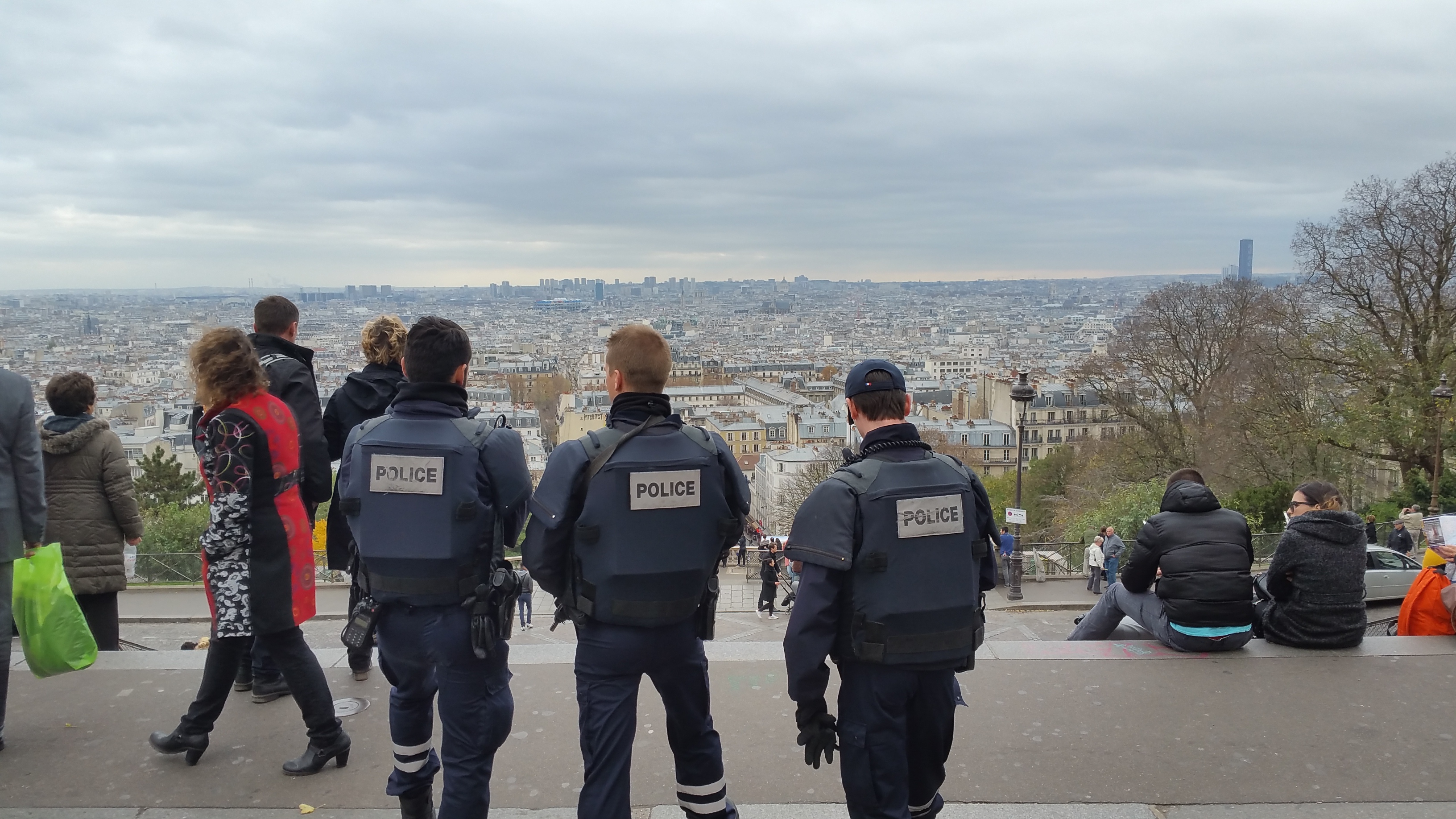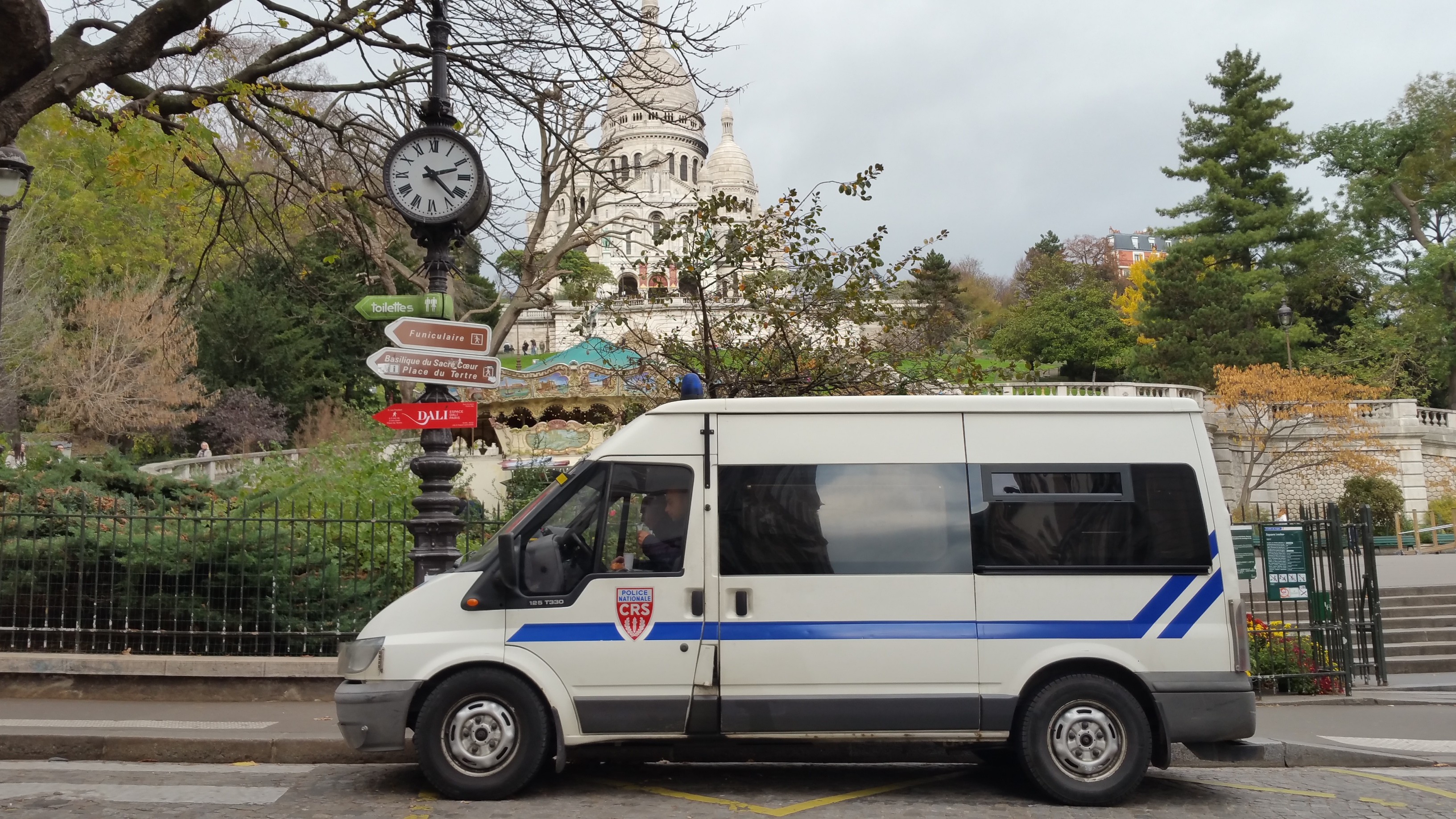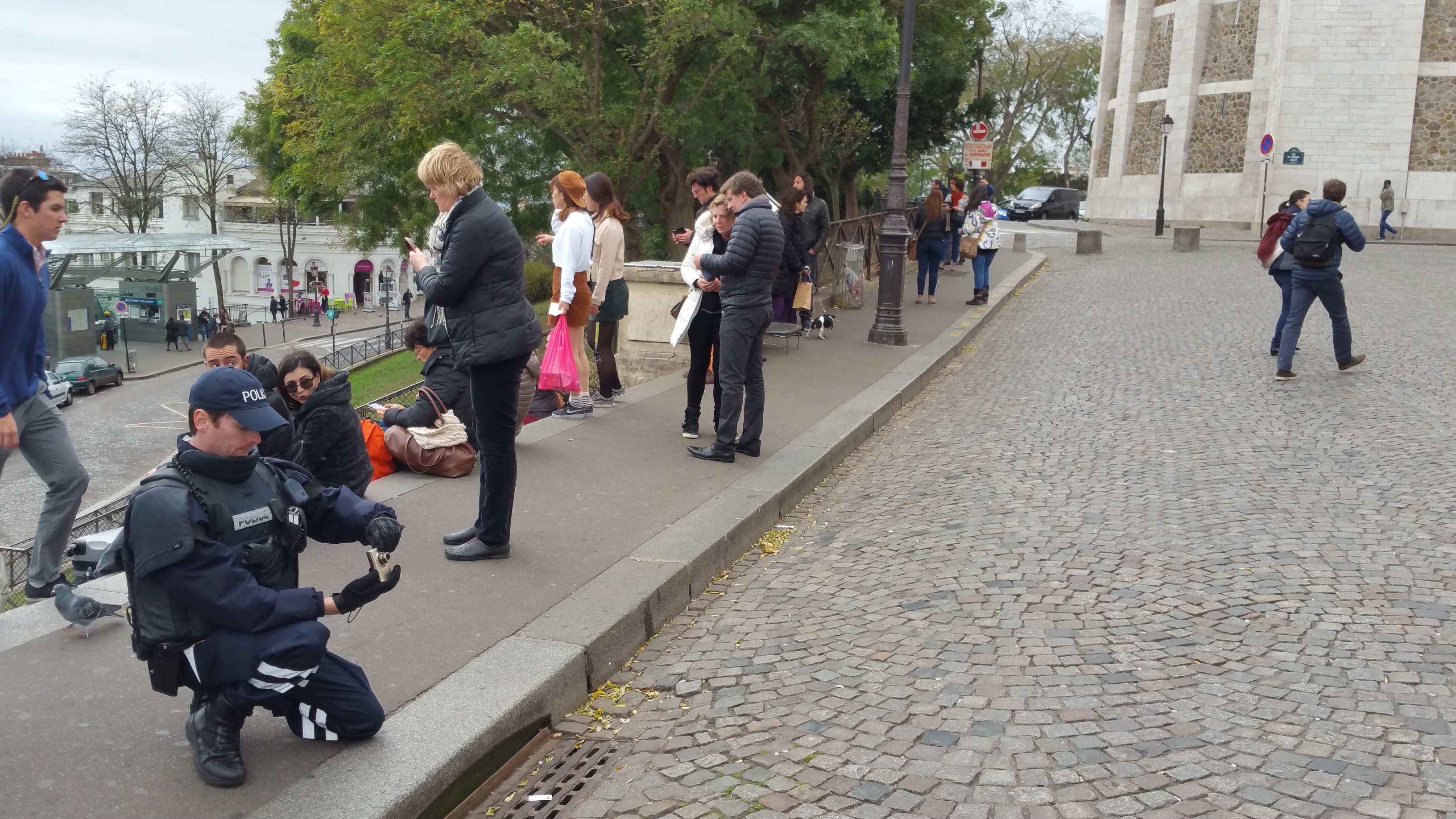 En haut du funiculaire de Montmartre, des policiers regardent en contrebas. « Il me semble que l’atmosphère est retombée, non ? », commente Bernard, un touriste londonien. « Enfin, je ne suis arrivé que ce matin ». Effectivement, seuls le silence et le vent semblent régner sur la colline du funiculaire. Quelques familles circulent, les enfants jouent ; mais même dans cet endroit hors du temps, on ne voit pas grand monde sourire. Un couple de touristes japonais demande à un policier s’il peut les prendre en photo. Le policier s’exécute, s’y essaye à plusieurs fois pour bien cadrer, ses collègues s’amusent : « Tu as besoin d’aide ? ».