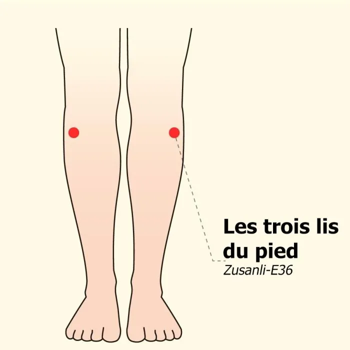 Localisation : sur le côté externe de la jambe inférieure, à environ quatre largeurs de doigt sous le bord inférieur de la rotule, et à une largeur de pouce du bord antérieur du tibia.