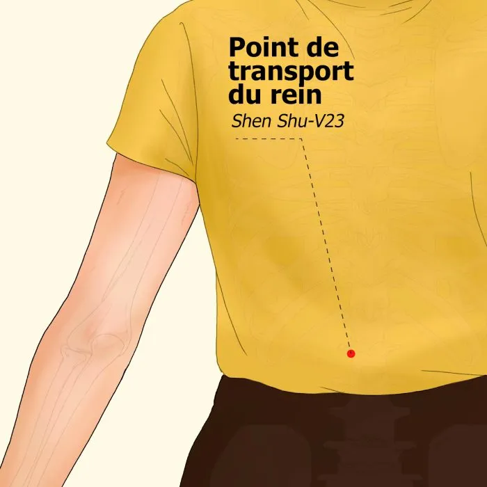 Localisation : sous l’apophyse épineuse de la deuxième vertèbre lombaire (L2), à environ deux largeurs de doigt de la ligne médiane.