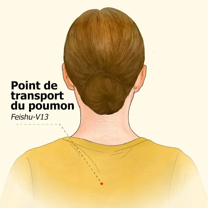 Localisation : sur le dos, spécifiquement au niveau du bord inférieur de l’apophyse épineuse de la troisième vertèbre thoracique (T3), à environ deux largeurs de doigt de la ligne médiane.
