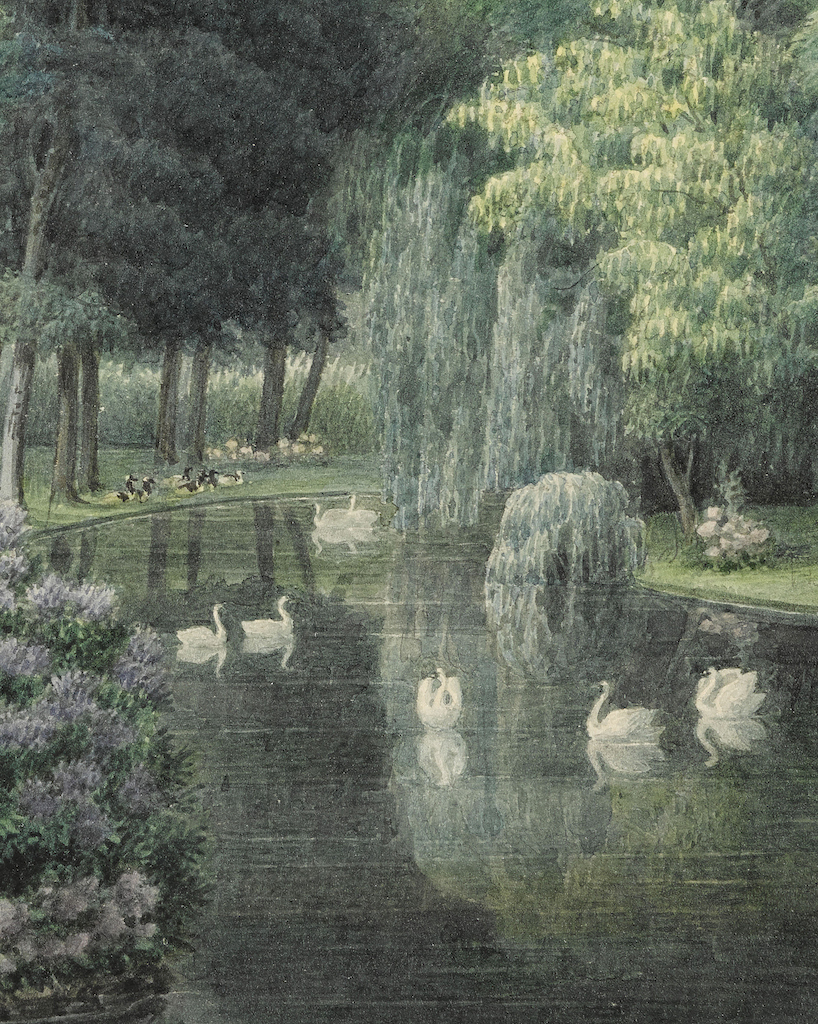 Auguste Garnerey a le talent de saisir la splendeur des parcs dans ses aquarelles : les dénivelés du terrain donnent du mouvement, les différentes tonalités de vert du feuillage, les coloris des fleurs, les rayons de soleil posés sur les pelouses, l’éclat de la lumière de midi sur les chutes d’eau, la grâce des cygnes nageant dans le lac, bref une fraîche et élégante sérénité règne partout.