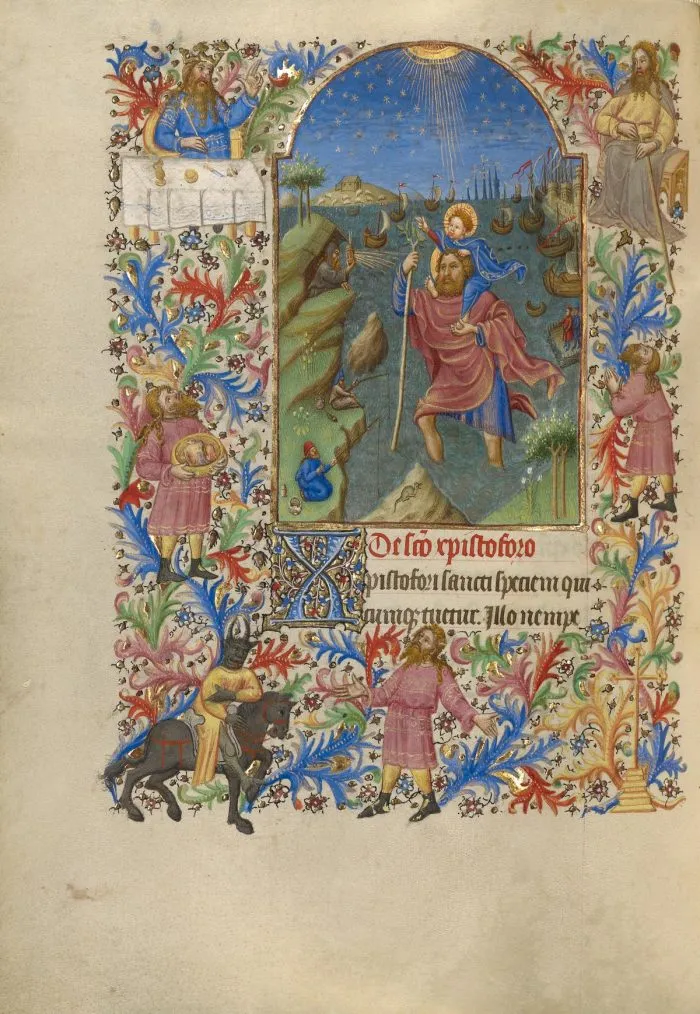 Saint Christophe portant l’Enfant Jésus, extrait d’un Livre d’Heures, vers 1420, par le Maître de Spitz. Couleurs à la détrempe, or et encre ; 20,2 × 14,9 cm. (Getty Center, Los Angeles. Getty Museum)