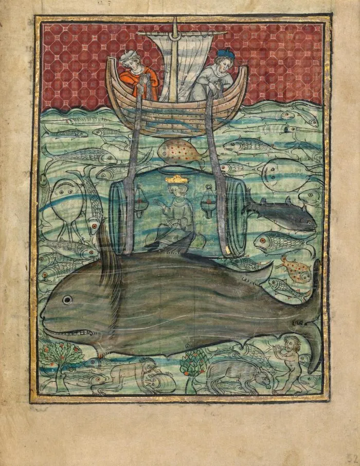 Alexandre le Grand sous l’eau, extrait du « Roman d’Alexandre », vers 1290–1300, France ou Belgique. Couleurs à la détrempe, or et argent, et encre sur parchemin. (Getty Center, Los Angeles. Getty Museum)