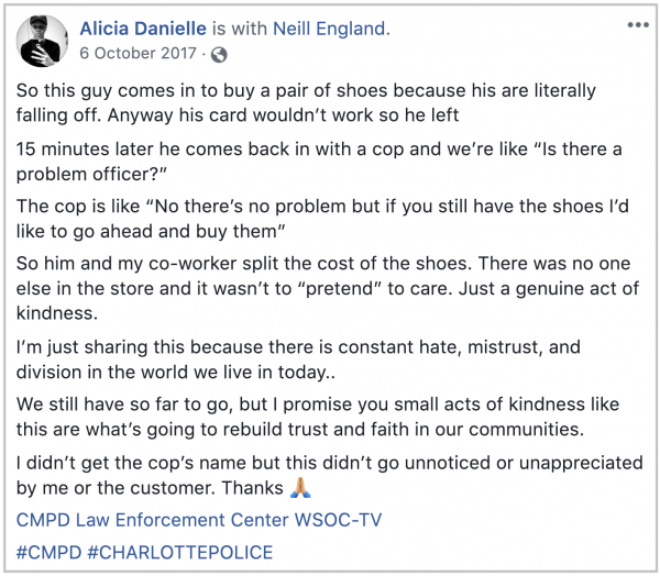 Le collègue de travail d’Alicia Danielle et l’agent ont décidé d’aider à acheter les chaussures pour l’homme en partageant les frais. Elle a souligné que l’action de son collègue et de l’agent était « un authentique acte de gentillesse », parce qu’il n’y avait pas de client dans l’atelier à ce moment-là et que « ce n’était pas pour ‘faire semblant’ de se soucier des autres ».