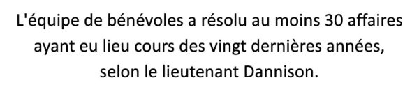 Selon M. Dannison, l’équipe de bénévoles a résolu au moins 30 affaires ayant eu lieu au cours des 20 dernières années, et réduit l’arriéré d’environ 85 cas.