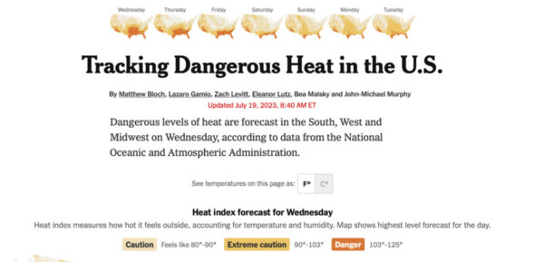 Mon exemple préféré est celui du toujours « fiable » New York Times, ce torchon du gouvernement, qui a adapté exactement le même modèle qu’avec le Covid-19 pour fournir à ses lecteurs de la classe dirigeante des informations actualisées sur « l’indice de chaleur » – et ce, complété par des images en diverses couleurs afin que tout le monde puisse rester en sécurité. Vous ne saviez probablement pas qu’il fait chaud en été ? Maintenant, vous le savez !