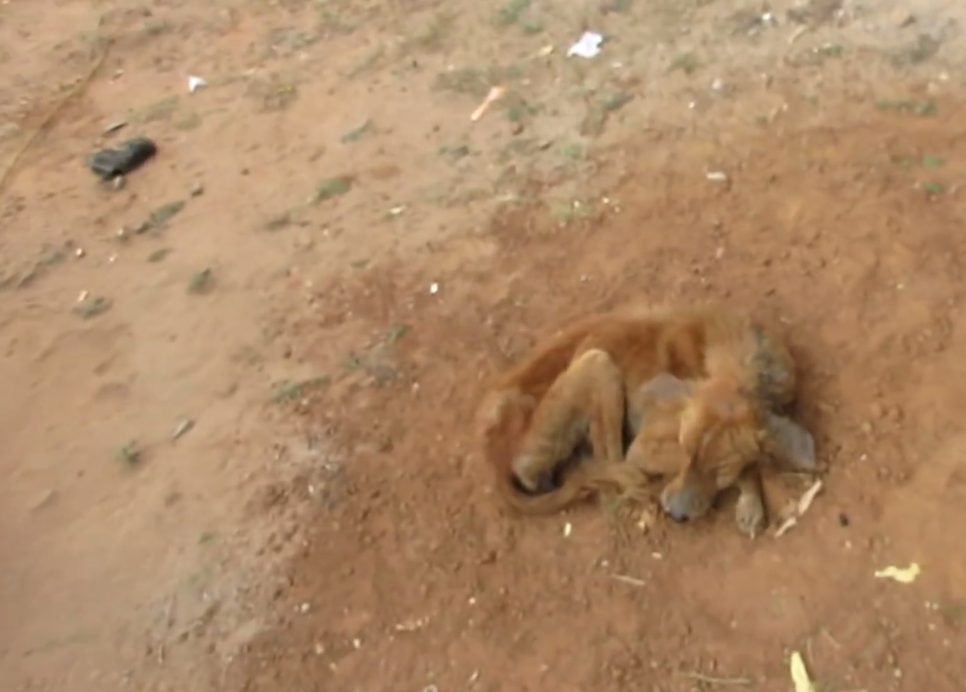 Dans cette vidéo, les sauveteurs ont reçu un appel au sujet d’une chienne en détresse qui n’avait pas bougé du même endroit depuis deux jours. Elle semblait avoir choisi cet endroit poussiéreux pour passer le peu de temps qu’il lui restait.