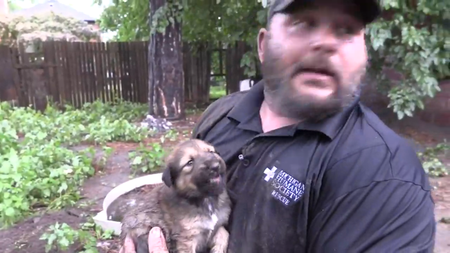 Dans une vidéo filmée par le refuge pour animaux, Chris et une autre secouriste, Pam, ont travaillé ensemble pour mettre les chiots en sécurité.