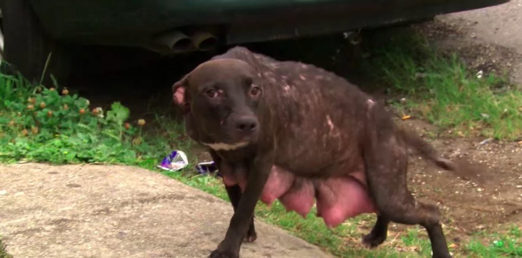 Cette chienne qui allaite a été trouvée errante dans le parking d’un supermarché de la Nouvelle-Orléans, en Louisianne, dans le sud des États-Unis. Cette chienne pitbull était visiblement émaciée et affamée. L’agent de sécurité du supermarché a appelé le Villalobos Rescue Center, un organisme de sauvetage pour animaux ; l’équipe a été secouée lorsqu’elle a vu la chienne désespérée.