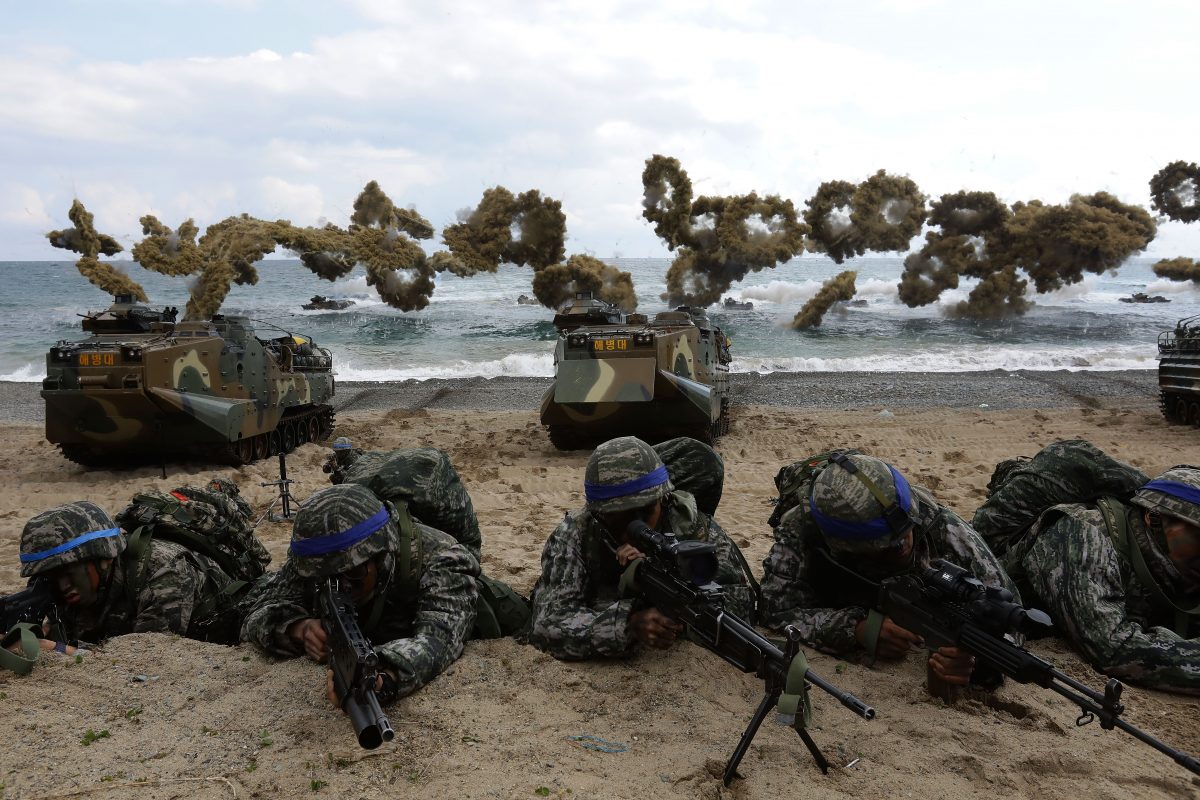 Des marines sud-coréens lors des exercices miliaires communs avec des troupes américaines à Pohang, Corée du Sud, le 2 avril 2017. (Chung Sung-Jun / Getty Images)