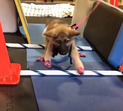 Après examen, le spécialiste a reconnu les symptômes et a déclaré que Starfish souffrait du syndrome du chiot nageur, une déformation du développement du chien nouveau-né.