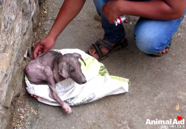 Ce chiot « hurle » alors qu’un sauveteur l’aide à sortir du sac qui l’emprisonnait. Six semaines plus tard, il est méconnaissable