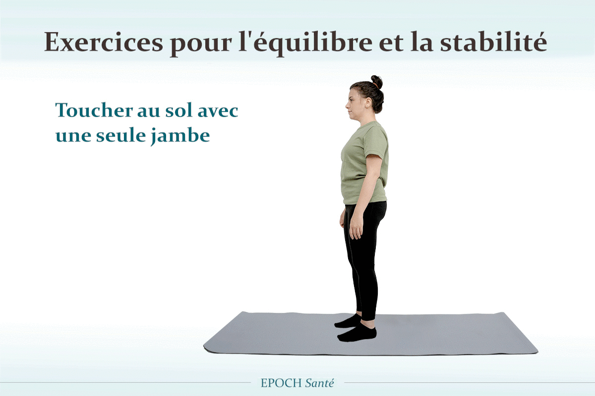 Cet exercice prend la position de la jambe unique et la transforme en un mouvement dynamique de haut en bas, créant ainsi une combinaison puissante pour améliorer l’équilibre. Pour augmenter l’intensité, on peut effectuer cet exercice immédiatement après la position de la jambe unique.