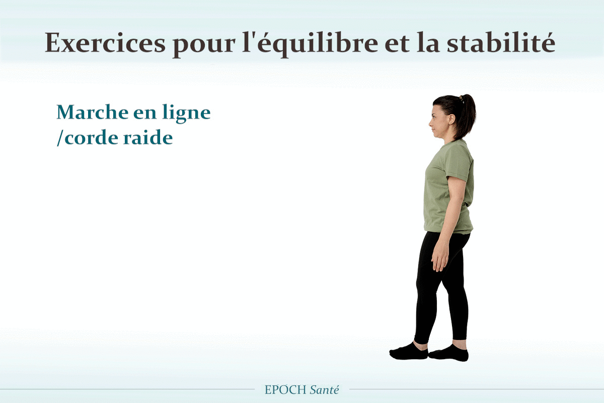Tenir les bras tendus le long du corps peut faciliter l’exercice. Croiser les bras peut augmenter la difficulté de l’exercice. Si on commence à perdre l’équilibre, il faut faire un pas en rétablissant l’écart normal des pieds pour le retrouver.