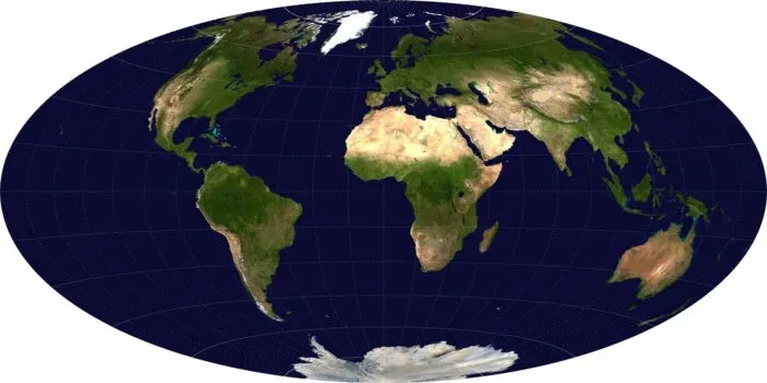 Dans toutes les projections d’Eckert, les pôles sont représentés par une ligne dont la longueur correspond à la moitié de celle de l’équateur. Elles constituent ainsi une solution intermédiaire entre la distorsion polaire extrême de la projection de Mercator et l’illisibilité croissante vers les pôles des projections de Mollweide et Hammer-Aitov. Photo : Strebe, CC BY-SA 3.0