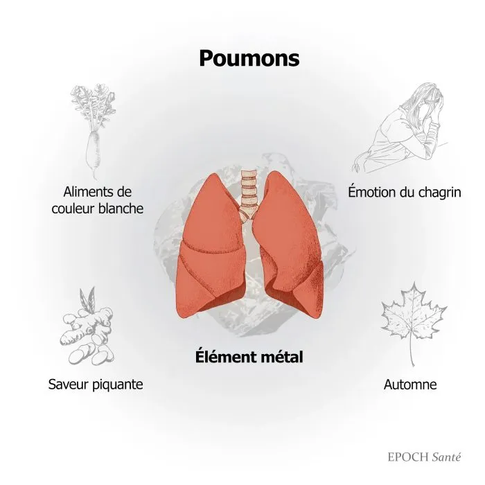 Selon la théorie des Cinq Éléments de la MTC, les poumons sont associés à l’élément métal. Ils correspondent également à l’émotion du chagrin, à la saison de l’automne, à la saveur piquante et à la couleur blanche.