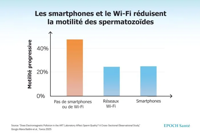 Les résultats ont montré que la motilité progressive des spermatozoïdes – leur capacité à se déplacer en ligne relativement droite – diminuait de 19,5 points de pourcentage après exposition à des appareils comme les smartphones et les réseaux Wi-Fi, comparativement aux témoins. La proportion de spermatozoïdes immobiles augmentait de 10 points.