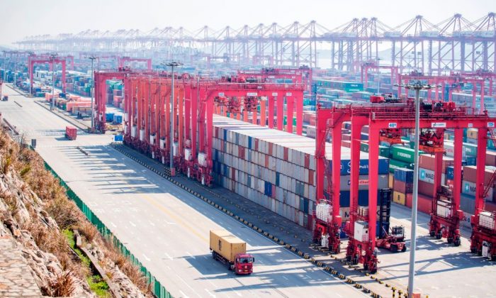 Des conteneurs stockés en piles au port de Yangshan, dans la zone de libre-échange de Shanghai, le 13 février 2017. (JOHANNES EISELE/AFP/Getty Images)