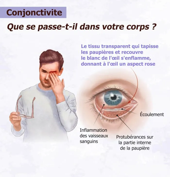 La conjonctivite infectieuse est causée par des virus ou des bactéries et se propage facilement par contact avec des surfaces, des sécrétions ou des mains infectées.