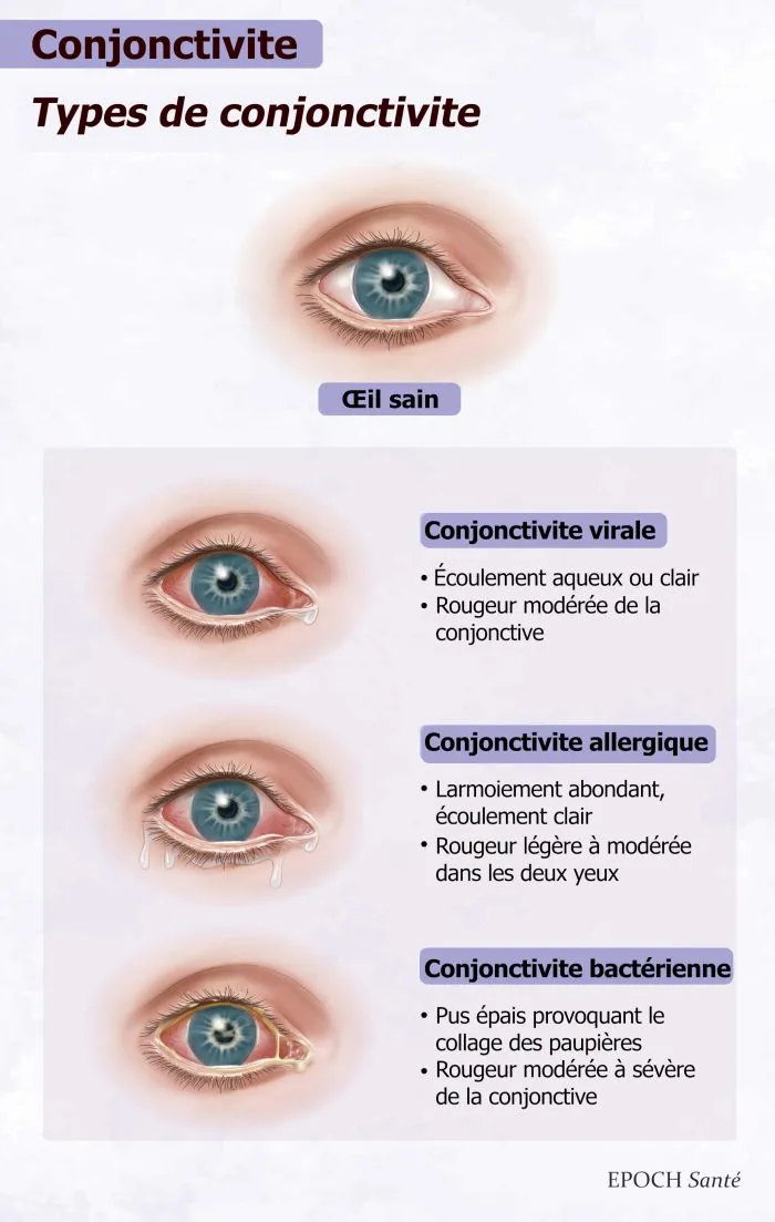 Il existe plusieurs types principaux de conjonctivite, chacun avec ses propres symptômes, causes et traitements.