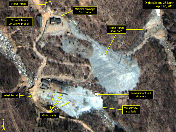 Site d’essais nucléaires de Punggye-ri, Corée du Nord, le 20 avril 2018. Un train de chariots miniers et une nouvelle structure non identifiée sont visibles dans la région de la pile de déblais près du portail ouest. (DigitalGlobe/38 Nord via Getty Images)