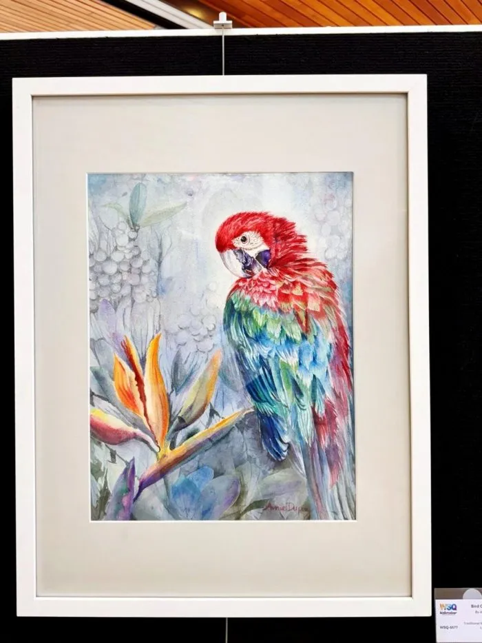 Une aquarelle signée Amie Dupuy, intitulée « Bird of Paradise », présentée à Brisbane, Australie, lors de l’exposition du 11 septembre 2025. (Daniel Y. Teng/Epoch Times)
