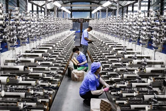 Des employés sur une ligne de production de fibre de carbone à Lianyungang, dans le Jiangsu, le 31 juillet 2025. L’autonomie technologique est un objectif clé du PCC. (STR/AFP via Getty Images)