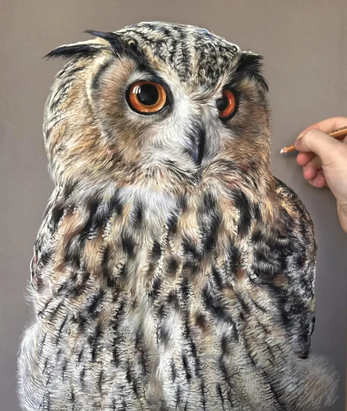 Si la démarche est technique, elle n’en demeure pas moins contemplative. Parmi ses œuvres les plus méditatives, une chouette dessinée « plus grande que nature », réalisée alors qu’il traversait une période de quête de sagesse personnelle.
