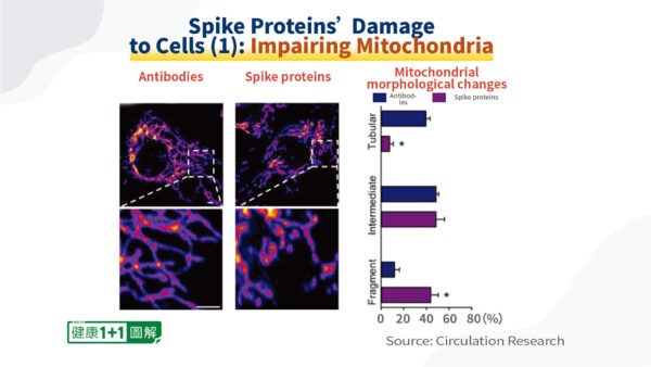 Les mitochondries produisent de l’énergie dans les cellules à partir de différentes sources, comme les aliments, par exemple, on dit pour simplifier que ce sont les « centrales électriques » des cellules. Une fois que les fonctions des mitochondries sont altérées, les cellules ne peuvent pas fonctionner correctement. Si une grande partie des cellules du foie ou des cellules du muscle cardiaque ne fonctionnent pas correctement, les fonctions des organes peuvent être endommagées. C’est une des raisons pour lesquelles les protéines spike provoquent des symptômes tels que le brouillard cérébral et l’insuffisance cardiaque.