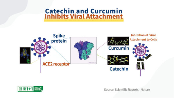 Une étude publiée dans Nature a étudié ces deux composants et a découvert que la curcumine se lie au domaine de liaison aux récepteurs des protéines spike et que la catéchine se lie aux acides aminés proches du domaine de liaison aux récepteurs, empêchant ainsi les protéines spike de se lier aux récepteurs ACE2 et bloquant l’entrée des protéines spike dans les cellules.