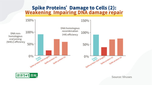 Il a été découvert que, par rapport au groupe témoin, les protéines spike dans trois états différents, y compris la protéine spike pleine longueur, la sous‑unité S1 de la protéine spike et la sous‑unité S2, causaient de graves dommages à la capacité innée de l’ADN des mammifères à s’autoréparer, la protéine spike pleine longueur causant des dommages particulièrement graves.