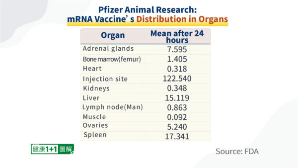Après 24 heures, les chercheurs ont examiné la distribution du vaccin à ARNm chez les rats et ont constaté qu’en plus du niveau le plus élevé au point d’injection, les niveaux les plus élevés suivants se trouvaient dans la rate, le foie, les glandes surrénales, les ovaires, la moelle osseuse, les ganglions lymphatiques, les reins, les muscles et le cœur, dans l’ordre de la concentration.