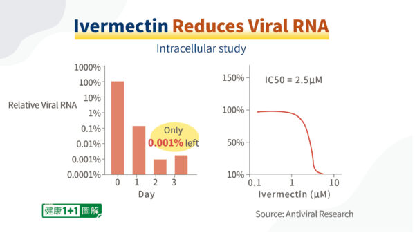 Dans une étude in vitro sur l’ivermectine publiée dans Antiviral Research, les chercheurs ont ajouté de l’ivermectine à des cellules infectées par le virus SRAS‑CoV‑2, puis ont récolté le surnageant et le culot cellulaire pour une analyse plus approfondie. Il a été révélé que dans les 48 heures suivant l’ajout de 5 μM d’ivermectine, l’ARN viral du SRAS‑CoV‑2 avait chuté de 99,999%, ne laissant que 0,001%.