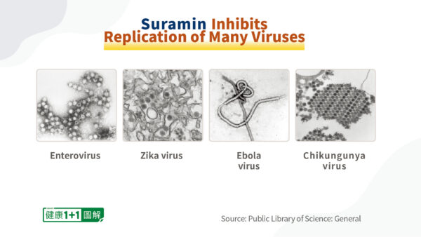 La suramine est un médicament centenaire qui a également été utilisé pour la première fois pour traiter la maladie des vers parasites appelée onchocercose. Outre le traitement des maladies parasitaires, elle s’est avérée efficace pour inhiber la réplication de nombreux virus, notamment l’entérovirus, le virus Zika et le virus Ebola.