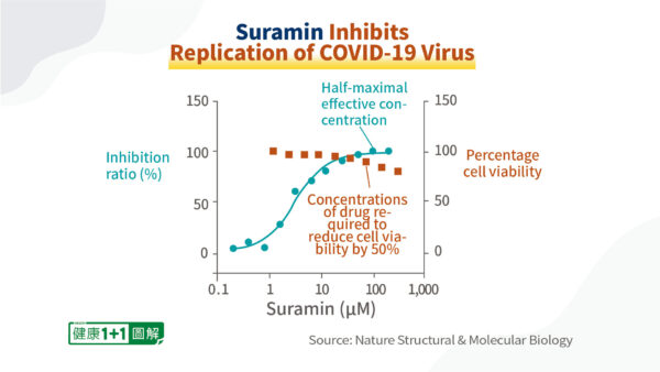 Le 5 mars 2021, l’Académie chinoise des sciences, l’Académie chinoise des sciences médicales et l’Université de Tsinghua ont publié une étude dans Nature Structural & Molecular Biology indiquant que la suramine s’avérait être un inhibiteur efficace de l’ARN réplicase (RdRp) du virus SRAS‑CoV‑2 dans un test in vitro, et qu’elle avait bloqué la réplication du virus.