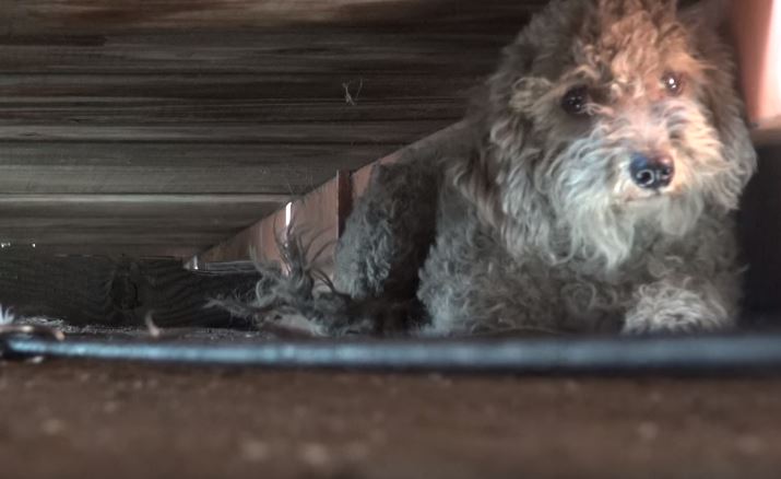 En voyant la chienne très craintive, l’équipe décide de lui mettre une laisse en premier lieu. Ce qui prend un certain temps puisque la femelle se faufile dans un espace restreint pour se protéger. Finalement, ils parviennent à passer la laisse autour de son cou puis la sortent lentement.