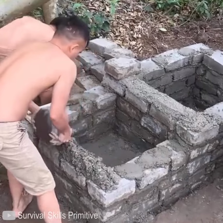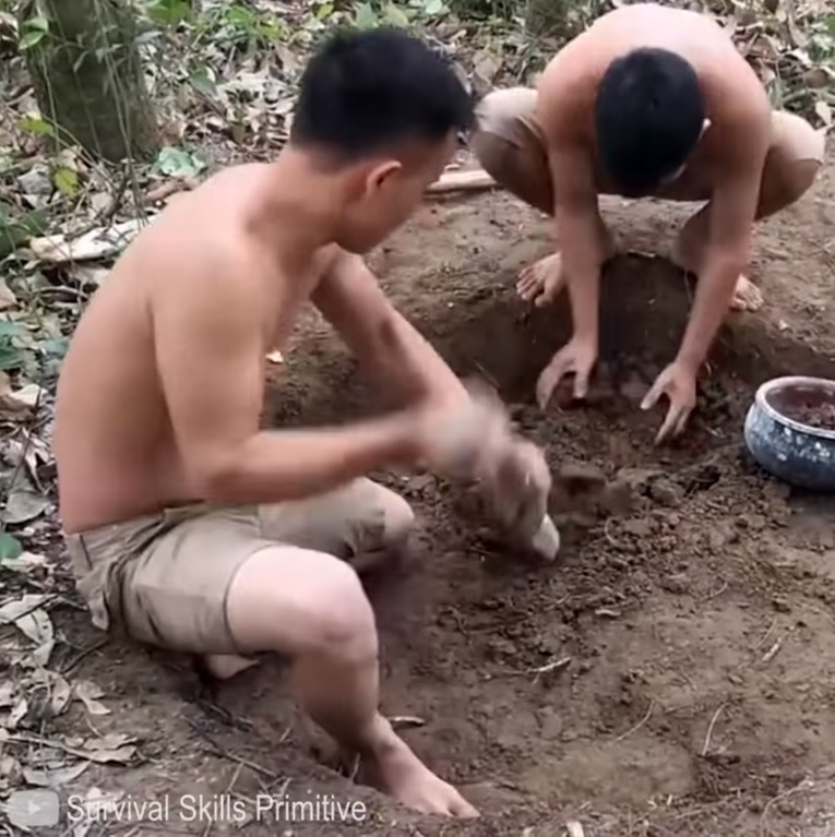 Ces deux hommes vous montreront comment faire un puits primitif complet avec un système de filtration en forêt. D’abord, ils creusent un trou circulaire, à la hauteur des épaules, dans le sol. Après cela, ils placent des briques les unes sur les autres pour couvrir le mur terreux du puits. Une fois le petit mur terminé, les deux hommes créent un seau à partir de la souche d’un arbre en brûlant son sommet jusqu’à ce qu’un trou assez profond pour être rempli d’eau soit formé.