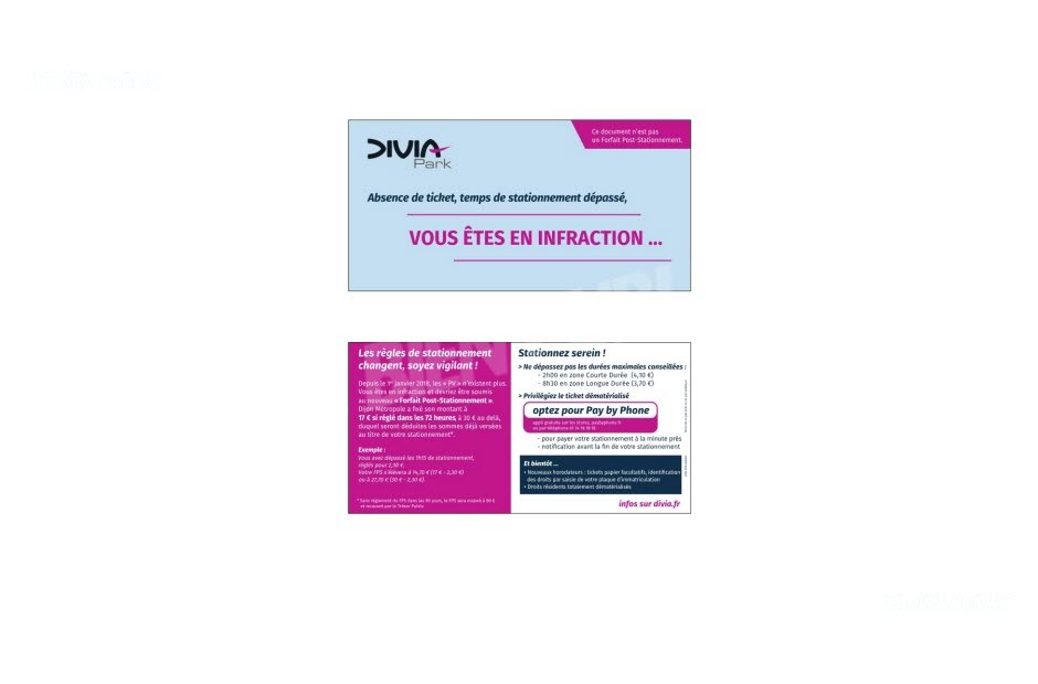 Dans le cas présent, la Mairie de Dijon décide donc des tarifs à appliquer. La société de Divia, qui gère les transports en commun, est désormais en charge du contrôle de stationnement de la voirie. Début janvier, ses agents ont commencé à distribuer de drôles de prospectus sur les pare-brises des voitures dépassant le stationnement : de « faux PV » -ou « flyers pédagogique », dans les mots de Divia- indiquant simplement l’infraction aux automobilistes. D’ailleurs, de nombreux ont eu du mal à comprendre s’il fallait qu’ils payent une amende -rien n’était indiqué sur le papier- ou contactent les autorités.