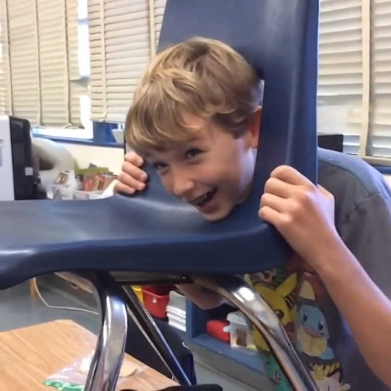 Dans cette séquence, ce garçon plaisantait sans doute avec ses amis lorsqu’il a mis sa tête à travers le trou d’une chaise de classe. Mais, pas de chance, il est resté coincé…
