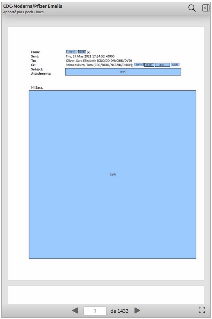 Le Dr Oliver correspondait avec un employé de Pfizer ou de Moderna, dont le nom et l’adresse électronique ont été expurgés dans la copie obtenue par Epoch Times.
