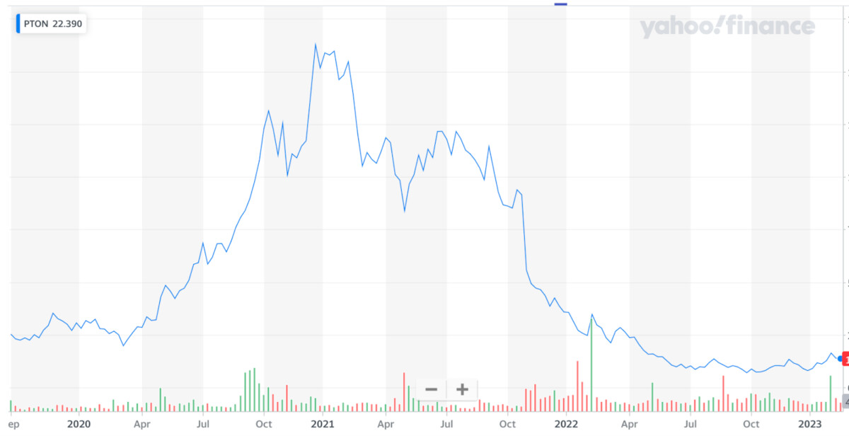 Peloton a connu une expansion spectaculaire, le cours de son action atteignant 167 dollars (158 €) au plus fort du confinement, pour retomber à moins de 13 dollars (12,3 €) actuellement. L’entreprise et ses employés croyaient vraiment que les bons moments allaient durer éternellement. Mais ce n’est pas le cas, et l’entreprise perd maintenant énormément d’argent. Comme tous les autres dans ce secteur de l’industrie du confinement, elle a vu une chute vertigineuse de ses activités.