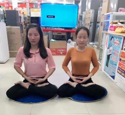 L’écrivaine (à droite) fait la méditation du Falun Dafa.