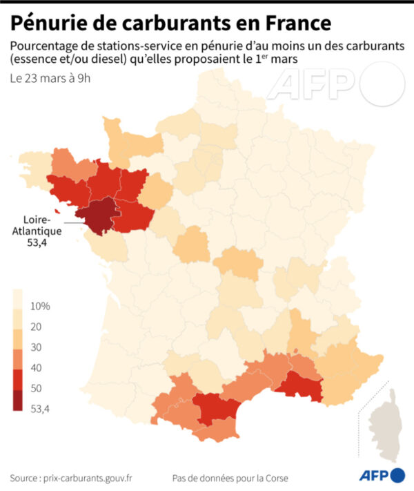 Ces tensions s’ajoutent à la pénurie croissante d’essence et de gazole dans les stations-service du pays : selon l’AFP, 15% des stations françaises manquaient de l’un ou l’autre de ces carburants jeudi, un taux qui monte à plus de 40% en Loire-Atlantique et dans plusieurs départements de Bretagne.