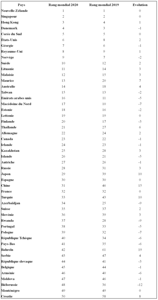 Voici la liste que la Banque mondiale a dressée des 50 pays où il était le plus facile de faire des affaires en 2020 :