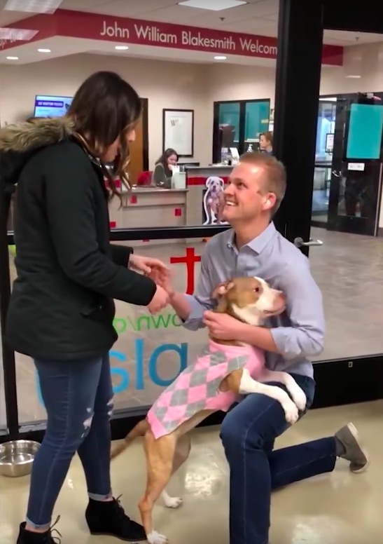 Un homme fait sa demande à sa petite amie avec l’aide d’un adorable chien de refuge qu’il vient d’adopter