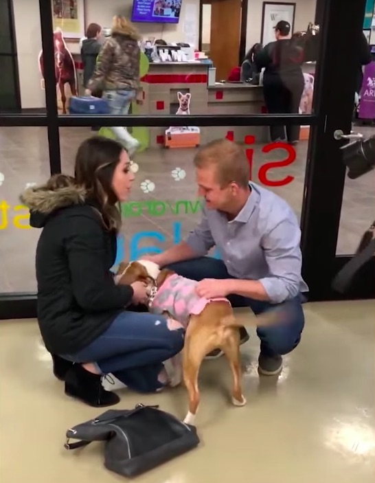 La vidéo montre Alison et Conner rencontrant leur nouveau chien de compagnie énergique, nommé Lizzie, adorablement habillé en rose et gris.
